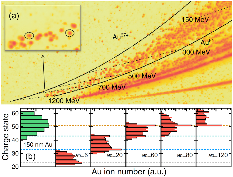 (a) 最高能量为1.2 GeV的TPS实验结果;(b) 超重离子(Au)的电荷态分布:绿色为实验结果,红色为PIC模拟结果