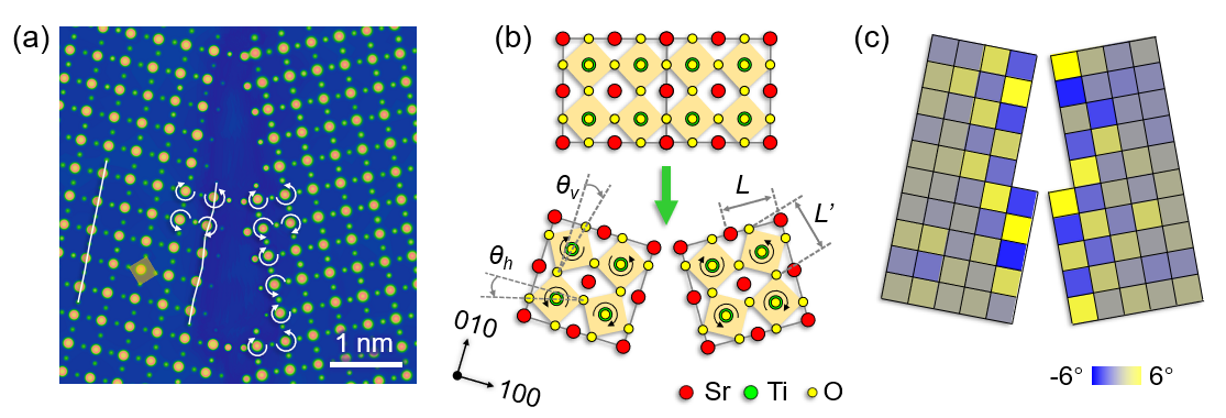 图:SrTiO3 Σ13晶界附近的AFD相。(a)晶界附近Ti、O原子位置图像,图中箭头和连线标识了晶界附近TiO6八面体的旋转,而远离晶界处的SrTiO3相是常规的立方结构。(b)晶界附近AFD相的原子结构示意图。(c)晶格尺度TiO6八面体旋转(θh)分布图。