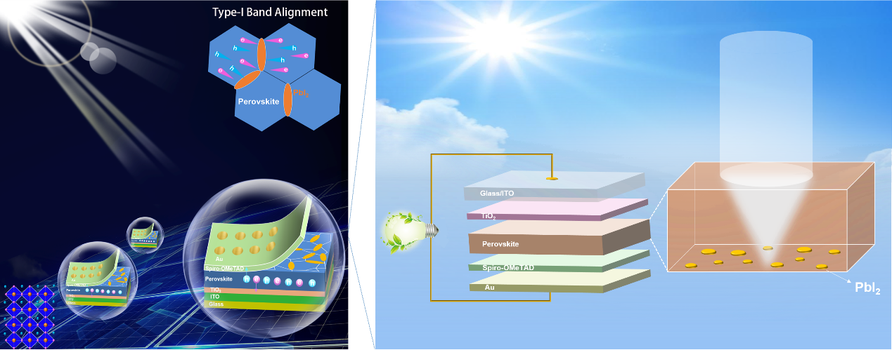 太阳能是一种取之不尽的清洁能源,发展高效且廉价的光伏技术将有助于我国实现碳达峰与碳中和的目标。钙钛矿是一种新兴的高效光伏材料,其可溶液加工和离子型晶体特性使钙钛矿薄膜的光伏效应被深能级缺陷显著削弱。既往的报道大多基于额外引入添加剂实现钝化;碘化铅(PbI2)作为钙钛矿的合成原材料和分解后的组分存在于钙钛矿薄膜中,本身就是一种天然的优良钝化剂,有望用于实现非添加剂的高效钙钛矿太阳能电池。然而,PbI2的光不稳定分解会在钙钛矿薄膜中引入孔洞,使器件稳定性下降。如何趋利避害地利用这把“双刃剑”,充分发挥其钝化效应一直是相关领域内的一个难题。