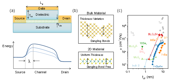 (a)场效应晶体管及相应能带示意图;(b)三维体材料与二维材料在结构上的对比,前者厚度波动明显,悬挂键多,后者厚度均匀,无表面悬挂键;(c)场效应管迁移率随沟道厚度的变化:当厚度降至5 nm以下时,体材料半导体的迁移率急剧下降,而二维半导体的迁移率较高