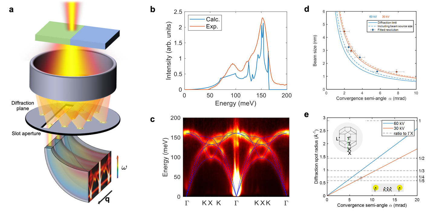 图1 (a)四维电子能量损失谱学实验原理示意图;(b)实验测量与第一性原理计算得到的金刚石态密度;(c)实验测量与第一性原理计算得到的金刚石声子色散关系;(d)不同电压下空间分辨率与会聚角之间的关系(目前优化的空间分辨率和动量分辨率距离衍射极限理论上限仅差约15%);(e)不同电压下的、动量分辨率与会聚角之间的关系(内插图为金刚石的倒空间)
