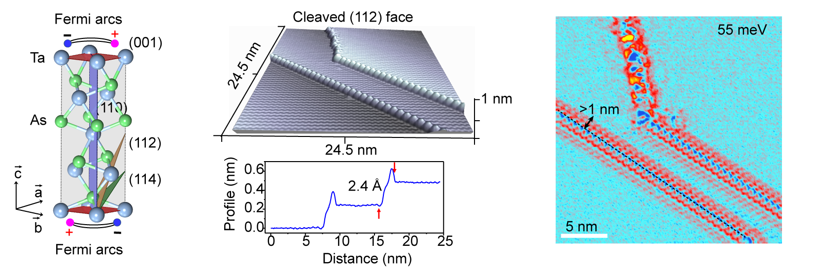 最近,北京大学物理学院量子材料科学中心杜瑞瑞教授课题组和冯济教授课题组合作,利用低温隧道显微镜及谱学测量方法,在TaAs单晶晶面台阶上(见图(中))观测到了原子尺度稳定的一维费米弧边界态,并通过对TaAs不同晶面的测量,监测到费米弧边界态随晶面指数从一维边界态到二维表面态的演化过程,例如图(右)给出了在(112)解离面上所观测到的清晰的一维费米弧边界态。