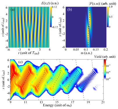 图1 (a)STOV的时空电场结构;(b) STOV的时空频谱结构;(c) STOV驱动HHG过程得到的特征光谱