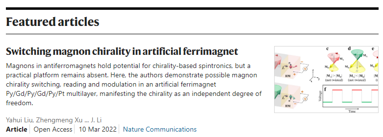 2022年3月10日,相关研究成果以“人工亚铁磁中磁振子手性的切换”(Switching magnon chirality in artificial ferrimagnet)为题,在线发表于《自然·通讯》(Nature Communications),并且被编辑推荐为亮点文章(Featured articles)。北京大学物理学院量子材料科学中心2016级博士研究生刘雅卉为第一作者;栗佳、孟洋、牛谦为共同通讯作者。