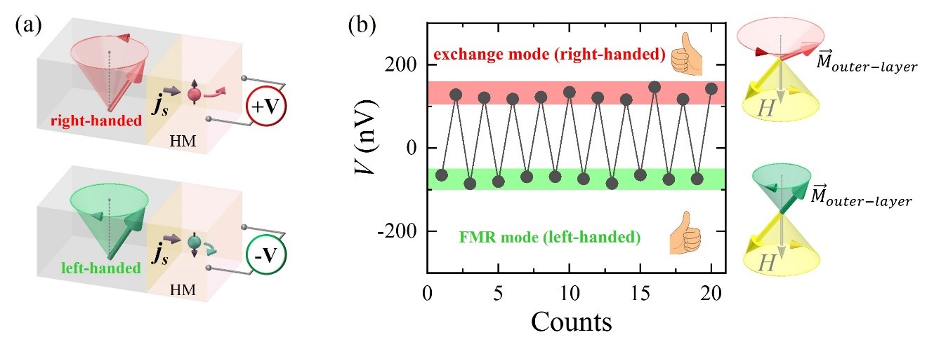 图 磁振子的手性作为独立自由度进行调控。(a) 右手与左手手性的磁振子携带相反的角动量,通过自旋泵浦产生自旋极化方向相反的自旋流;(b) 通过调控人工亚铁磁样品的共振模式,成功实现磁振子手性的调制;同时利用人工亚铁磁样品只有最外层铁磁层(Mouter-layer)贡献自旋泵浦的优势,通过逆自旋霍尔电压实时读取磁振子的手性。