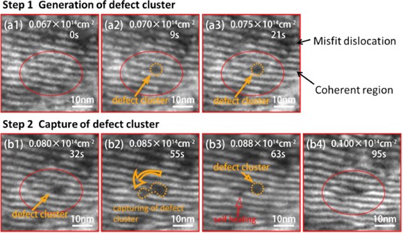 图 2 重离子原位辐照实时观测离子辐照缺陷的产生和消失过程。PTEM图像是g=MgO(002)双束条件下重离子辐照剂量为0.067 × 1014 cm-2~0.100 × 1014 cm-2时拍摄的视频录像截图。图中失配位错的Burgers矢量为 b=1/2aFe [011]。(a1-a3) 为剂量范围从0.067 × 1014 cm-2到0.075 × 1014 cm-2的重离子辐照时,在Fe/MgO界面附近产生缺陷簇,缺陷簇的直径约为5 nm。 (b1-b4) 失配位错捕获辐照缺陷的过程,离子的剂量范围从0.080 × 1014 cm-2到0.10 × 1014 cm-2。 (b1-b2) 缺陷簇分裂为两个分裂的缺陷簇并迁移到相邻的失配位错。(b3) 位于失配位错核心的分裂缺陷簇的湮灭,失配位错表现出自修复特性。(b4) 位于共格区域的分裂缺陷簇在辐照过程中保持稳定。