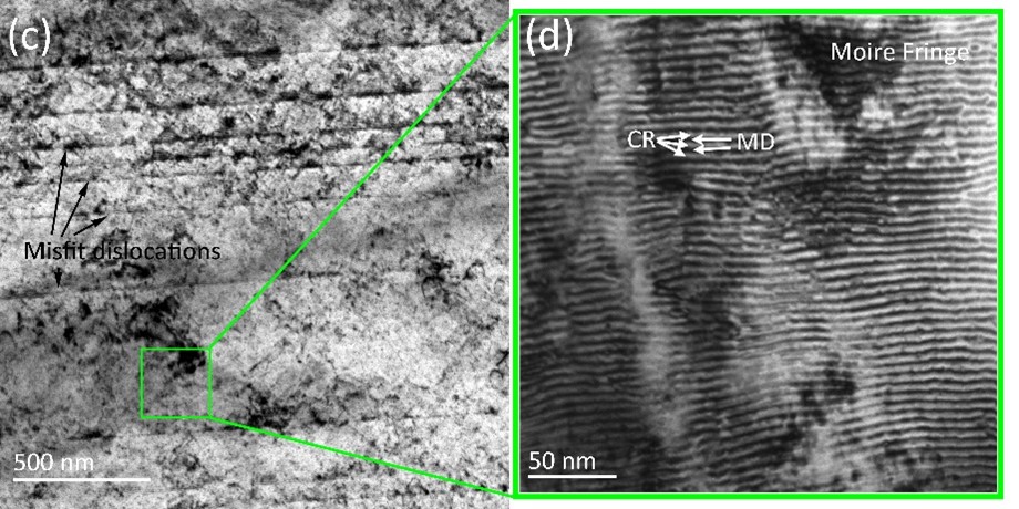 图1 双束条件下平面透射电镜(PTEM)图像确定出界面失配位错网。(a) g = MgO(022) 的明场PTEM图像,可以观察到两组互相垂直的位错;(b) 相应的暗场图像;(c) g = MgO(002) 的明场PTEM图像; (d) 为图 (c) 中绿色框的放大图,可以清楚地观察到摩尔条纹和共格区域。