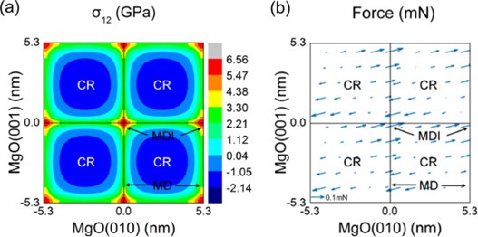 图3 (a) Fe/MgO界面应力分量的等值线图。 CR是Fe/MgO的共格区域。黑线为失配位错,失配位错的交点为MDI。发现MDI处的应力远大于相干区域的应力。(b) Fe/MgO界面处 b = 1/2aFe [111]位错的驱动力,表明位错在界面应力场所受的力方向指向失配位错交点。
