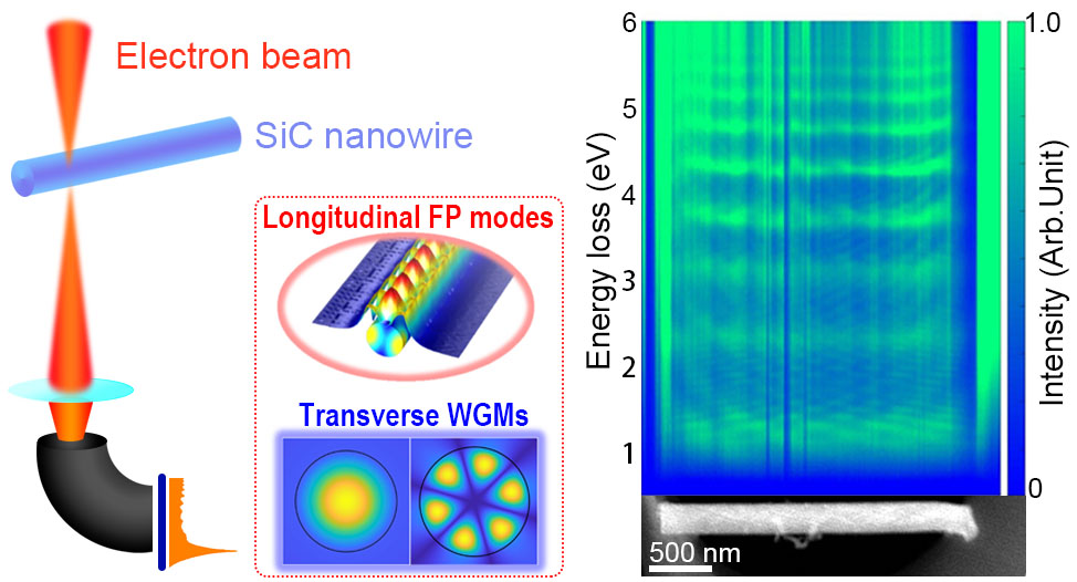 北京大学电子显微镜实验杜进隆、量子材料科学中心和电子显微镜实验高鹏与现代光学研究所肖云峰课题组利用扫描透射电镜-电子能量损失谱技术的高空间分辨、宽能量匹配和大动量匹配的优势,研究展示了单个纳米结构中纵向法布里一珀罗和横向回音壁模式的同时测量,相关工作以“电子显微镜在超宽能量和动量匹配探测SiC 纳米线中的电子-光子相互作用“(Electron microscopy probing electron-photon interactions in SiC nanowires with ultra-wide energy and momentum match)为题发表在《纳米快报》(Nano Letters)。