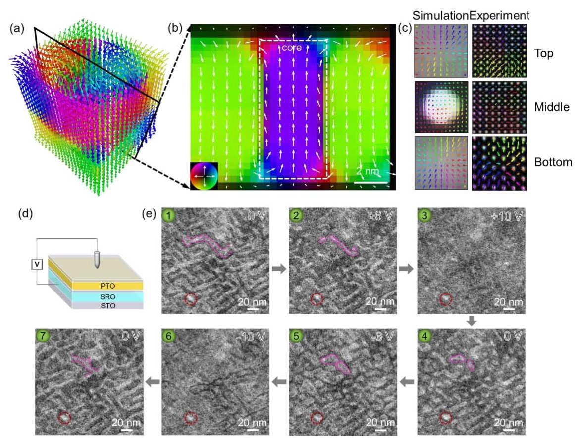 图:(a) 极性斯格明子的三维极化分布;(b) 斯格明子核心截面的极化分布;(c) 斯格明子从上至下不同平面的极化分布,分别为中心发散型、涡旋型、中心收敛型;(d) 原位STEM实验装置示意图。钨针和SRO导电层作为正负极施加电场;(e) 极性斯格明子在一个电场周期下的演化图。紫色虚线:斯格明子条在正电场下先收缩断裂形成斯格明子泡,然后变小消失