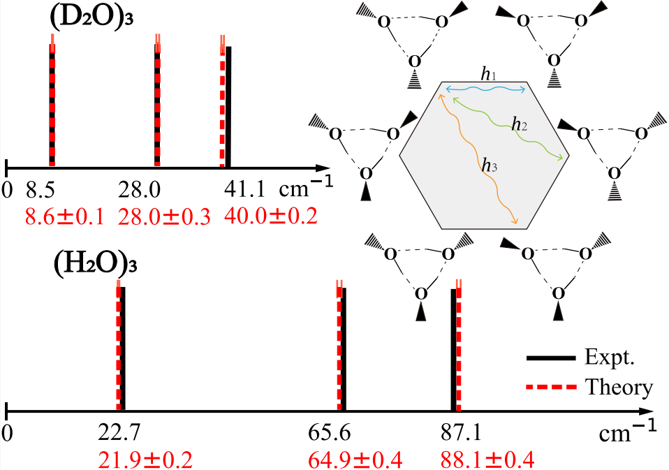 北京大学物理学院凝聚态物理与材料物理研究所、人工微结构和介观物理国家重点实验室、纳光电子前沿科学中心、轻元素先进材料研究中心李新征课题组与中国科学院大连化学物理研究所张东辉院士团队、江凌研究员、以及复旦大学化学系方为教授合作,总结出一套计算分子团簇隧穿劈裂谱的新方法,并将其应用至水的三聚体中,获得可以与实验观测在波数精度吻合的精确定量模拟结果。2022年11月22日,相关研究成果以“水三聚体中的扭动隧穿劈裂”(Torsional tunneling splitting in a water trimer)为题,正式在线发表于《美国化学会志》(J. Am. Chem. Soc. 144, 21356 (2022))。