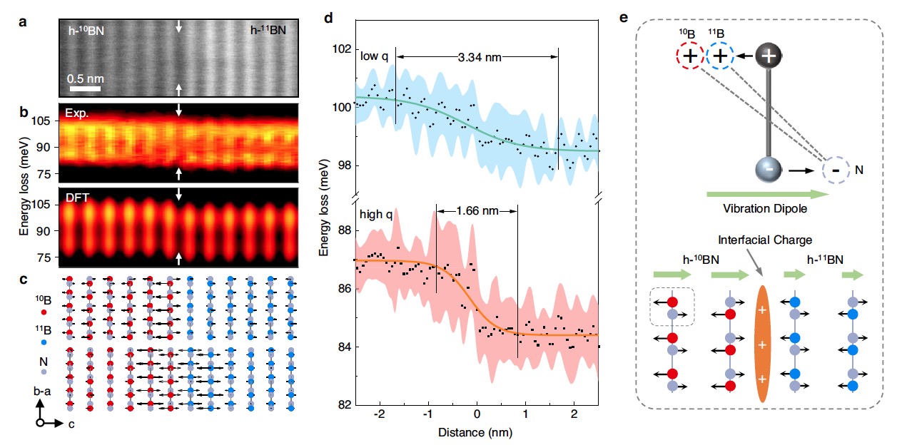 北京大学物理学院高鹏、陈基、王恩哥等,与北京大学材料科学与工程学院刘磊等合作,首次实现了在原子尺度上对同位素界面的研究。原子尺度上探测同位素界面极具挑战。目前具有原子分辨能力的实验技术只有扫描探针显微镜和透射电子显微镜,而前者只能探测表面,后者虽然可以探测包埋的界面,但是所有的电镜成像和电子衍射技术都只对质子数目敏感而对中子不敏感,因此无法识别同位素。北大的研究团队利用电镜的非弹性散射技术,根据同位素声子能量的差异,首次在原子尺度上实现了对同位素界面的识别和探测,展示了电镜在研究原子核量子效应方面的潜力。他们构筑了纯化的氮化硼h-10BN和h-11BN同位素范德华界面,利用扫描透射电子显微镜的电子能量损失谱技术在原子分辨下测量了同位素界面附近的声子模式,观察到了由电声耦合作用导致的布里渊区中心和边界的声子在同位素界面上迥异的过渡区域长度。由于自然界中绝大部分物质都是同位素混合物,该工作表明同位素之间会产生新的界面效应从而改变局域的物理性质,为理解天然材料的物性提供了新的视角。该研究成果以“同位素界面上的声子转变”(Phonon transition across an isotopic interface)为题,于4月26日发表在《自然·通讯》(Nature Communications 2023, 14, 2382)。