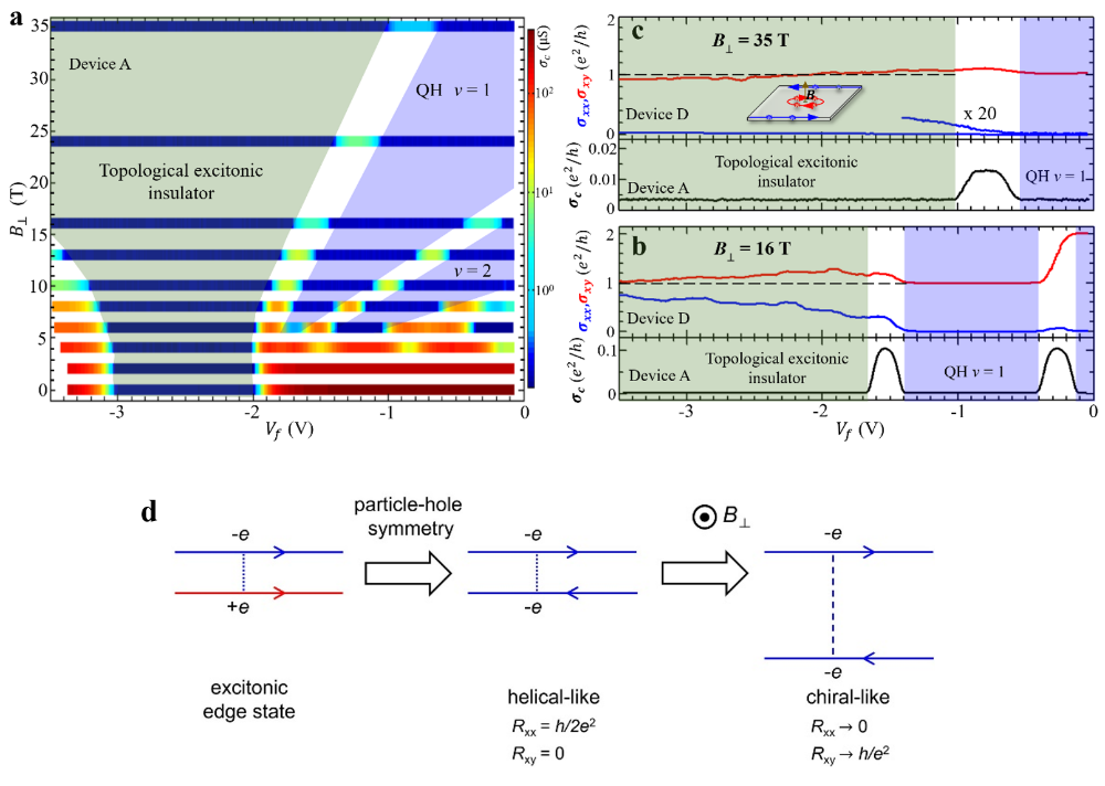 在实验上,作者发现在一个电子和空穴浓度很不平衡的门电压区域内(见图2a-2c,-2V到-3V),激子体态竟始终保持绝缘且存在着能隙,而在此前的研究中激子绝缘体态只在电子空穴浓度相等时才出现。在这个区域内,输运测量揭示了体系存在着拓扑边缘态,产生了一个拓扑激子绝缘区,如图2a所示。奇异的是,随着垂直磁场的增加,边缘态输运行为从零磁场下的类螺旋型(helical-like)逐渐转变为类手征型(chiral-like),最终在强磁场下边缘态电导接近量子化值(如图2b,2c)。上述实验现象与传统的霍尔效应截然不同,同时其磁阻行为也区别于量子自旋霍尔效应,无法用目前已知的对称性保护的拓扑物态理论所理解。
