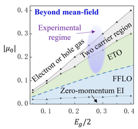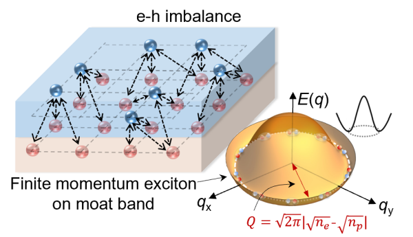凝聚态物理中,电子和空穴可以发生配对,产生等效的玻色子,即激子,而砷化铟/锑化镓反转型量子阱可以提供研究激子基态的可控平台。该工作研究了电子-空穴耦合的双层系统,发现当电子和空穴浓度不平衡时,系统所产生的激子具有moat型能带(如图1左所示),强阻挫效应避免了激子凝聚相的出现,从而产生一类具有长程量子纠缠的激子拓扑序(excitonic topological order)。考虑了阻挫效应导致的量子涨落之后,系统的完整相图如图1右所示。相比于传统的平均场理论结果,该工作发现量子涨落会导致在激子绝缘相中出现一个新的激子拓扑序区域。
