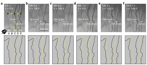 图1. 电场驱动单个位错移动。(a)实验装置示意图,通过金属针尖对样品加载电压。(b)位错线的初始位置。(c)加载电压达到正102 V时,位错线运动到右侧位置。(d)加载电压达到负90 V时,位错线运动到左侧位置。