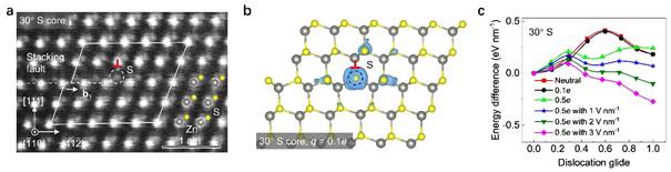 为了理解电场如何驱动位错移动,他们表征了位错核的原子结构,然后结合密度泛函理论计算分析了位错核的电子结构。图3a展示了一个典型30° S位错核的原子结构。较亮的圆斑对应的是Zn原子列,较暗的圆斑是S原子列。理论计算表明带负电的30° S位错比电中性状态更加稳定,因此实际样品中的位错很可能是带电的,位错核附近的电荷分布如图3b所示。这种带电位错使得电场可以通过库伦相互作用来控制位错运动。图3c展示了位错滑移势垒在带电状态以及在外加电场下的变化趋势。他们也分析了ZnS中另外三种类型的位错,发现电场都可以降低位错的滑移势垒,从而从能量角度解释了电场控制位错移动的机制。