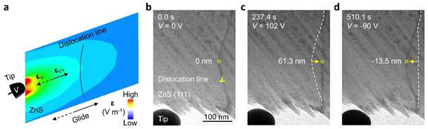 近期,高鹏课题组与Yu Zou教授、Qi An教授、Penghao Xiao教授的课题组合作,利用原位透射电子显微镜的局域电场技术研究了晶体中位错在电场下的演化行为,实现了非应力条件下仅仅由电场控制的位错运动。他们以半导体材料ZnS为例,图1展示了ZnS中电场驱动的位错运动。通过控制电场的大小和方向,就可以操控位错线的来回移动。比如当加载电压为正时,位错线向右侧运动。当加载电压为负时,位错线向左侧运动。整过过程中,应力效应可以忽略。这个结果为电场能够控制位错移动提供了直接的实验证据。