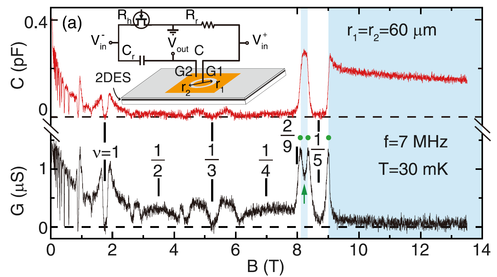 图1电容和电导随磁场变化的测量数据,插图为电桥测量示意图。