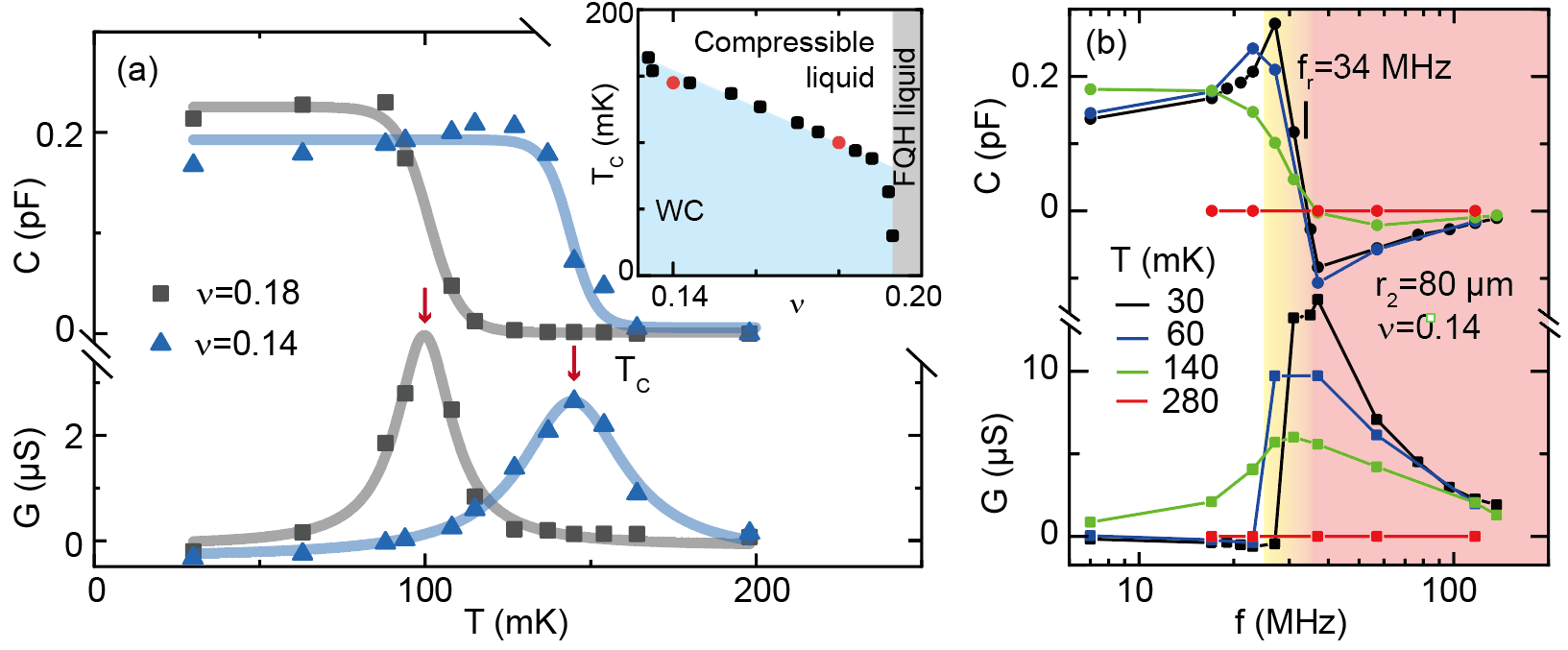 赵利利等人实现了一种高精度、低激励、极低温的无源电容桥测量方法。这种测量方案可以在从10mK到室温的连续变温过程中测量样品电容以及电导的变化,非常适合研究量子系统的物理特性以及与温度相关的变化趋势[1, 2]。他们将该方法用于研究具有低浓度、高迁移率的GaAs/AlGaAs中的二维电子系统,在朗道能级填充因子小于1/5时观测到了伴随着电导消失的巨大电容响应(如图1蓝色区域所示)。在外加电场的作用下,周期排布的电子集体运动产生极化电荷,对外表现出了电容性的响应。通过构建电子的运动模型,由电容可以推算出Wigner晶体的一系列物理参数大小,如钉扎强度、相干长度、介电系数和弹性模量等。此外,赵利利等人进一步研究了电子体系随温度的固-液相变,并通过改变测量频率研究了Wigner晶体的谐振现象(图2)。这一实验首次使用同一测量手段对单个样品中形成的Wigner晶体的众多特性进行了系统性研究,这些实验结论的一致性也对推进Wigner晶体的理论研究具有重要意义。