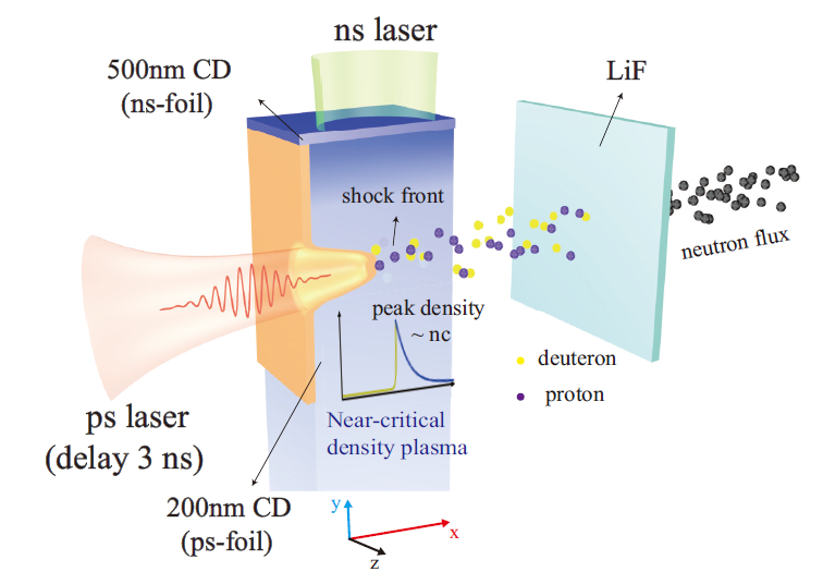 激光在近临界密度等离子体中能驱动无碰撞静电激波,激波波前拥有很强的纵向电场,能够在传播过程中连续反射并加速等离子体背景中的离子到高能量,并且不受荷质比的影响。与传统的靶背鞘场加速相比,无碰撞激波加速不仅在加速氘离子方面具有巨大优势,而且能够大幅增加高能氘离子的数量,通过与中子转换靶的核反应产生高通量的中子束流。