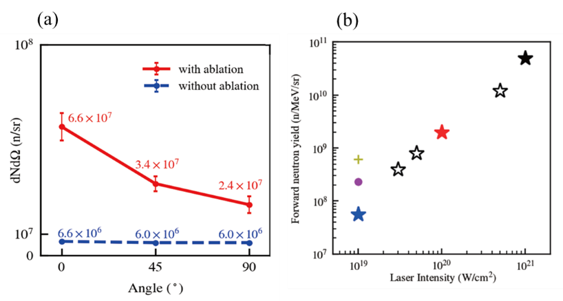 图二.(a)实验中得到的有无烧蚀情形下的中子产率对比。(b)前向中子产额随激光强度的变化的数值模拟结果。