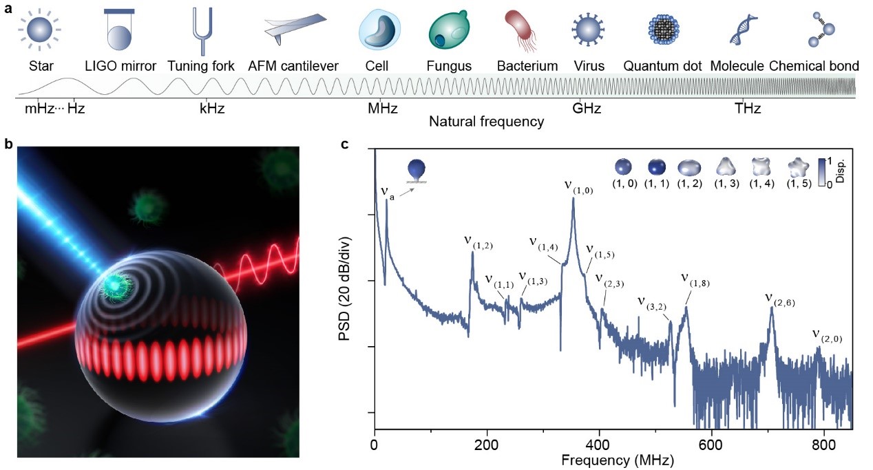 图1 基于光学微腔的单颗粒振动谱仪。a, 不同尺度物体具有不同的固有频率。b, 基于光学微腔的单颗粒振动谱测量原理图。c,典型的单颗粒振动谱。