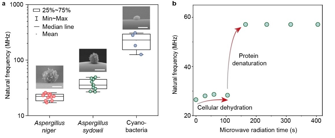 图2 微生物细胞的声学指纹识别。a,单个黑曲霉、聚多曲霉和蓝藻微生物细胞的固有频率测量统计分布图。插图:微生物SEM图像。比例尺:2微米。b,单个聚多曲霉细胞在微波辐照下,其固有频率随辐照时间的变化。
