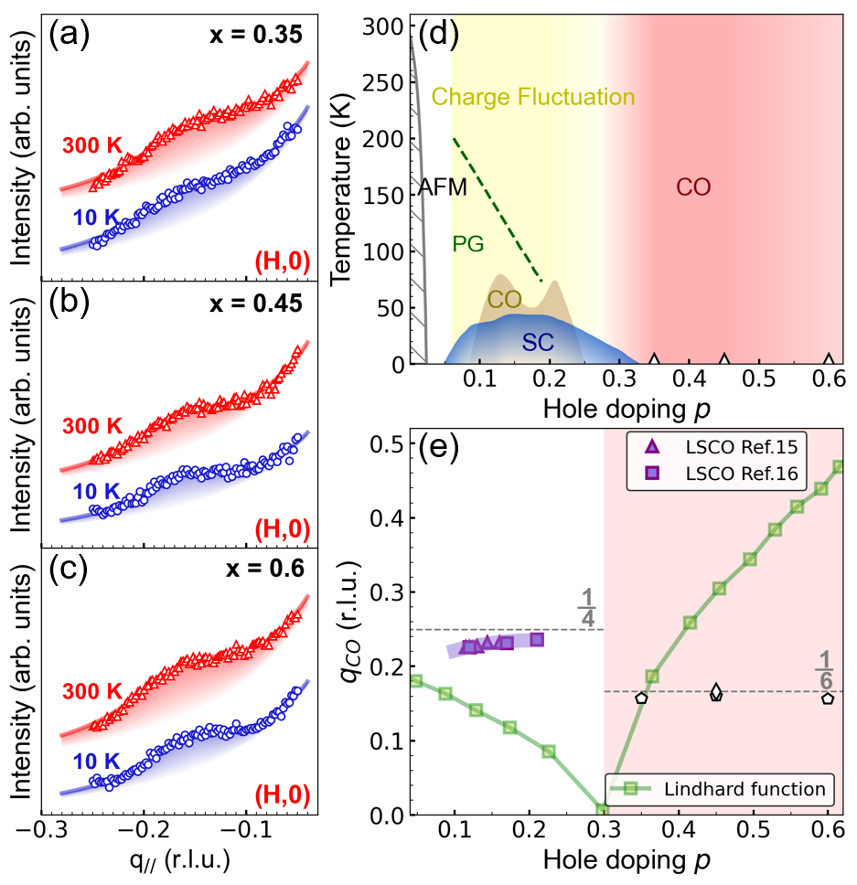 此前,彭莹莹与合作者在欠掺杂区域发现短程的电荷涨落,具有有限的能量尺度并且持续到很高的温度(Science 365, 906 (2019)),在铋系铜氧材料发现电荷序可以持续到最佳掺杂(Physical Review B 94, 184511 (2016)),甚至拓展到过掺杂赝能隙区域之外(Nature Materials 17, 697 (2018)),表明电荷序和赝能隙是不同的相。此次镧系铜氧体系电荷序的发现,证明了过掺杂电荷序的普遍性。理论计算发现用弱关联的费米面嵌套无法解释过掺杂电荷序的产生(图二e),表明过掺杂区域还存在额外的关联作用。于是,进一步理解过掺杂区域电荷序的微观机理可以给高温超导的出现带来新的启发。