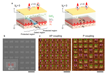 耦合纳米磁体系统示意图:a.电压调控反平行(左图)/平行(右图)耦合纳米磁体器件结构示意图;b.耦合纳米磁体电子显微镜图;c.耦合纳米磁体在反铁磁耦合(左图)铁磁耦合(右图)的磁力显微镜结果。