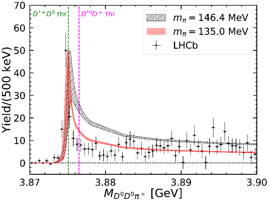 2021年,欧洲核子中心大型强子对撞机上的LHCb合作组发现了首个双粲四夸克态T+cc,引起了广泛关注。为了从第一性原理的QCD出发,对实验进行理论验证,并考察T+cc对 π 介子质量的依赖性,中日研究团队基于接近物理点(mπ=146 MeV)的格点QCD,提取了 D*与 D 介子之间的相互作用,发现该相互作用在长距离处具有双 π 交换主导的特征,且能够产生一个接近阈值的虚态;将 D*-D 之间的相互作用外推到物理点(mπ=135 MeV),上述虚态演化为一个弱束缚态,同时理论给出的 D0D0π+质量谱能够较好地再现LHCb的实验数据。