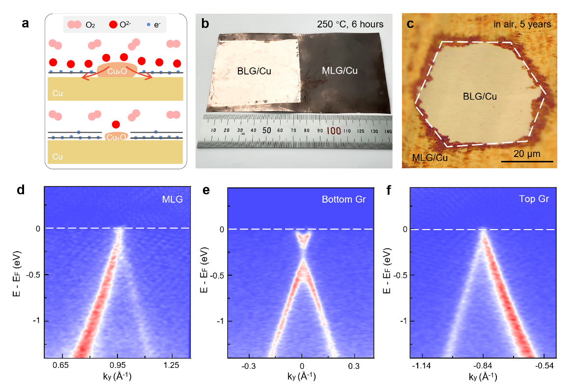 北京大学物理学院凝聚态物理与材料物理研究所、人工微结构和介观物理国家重点实验室刘开辉教授与上海科技大学王竹君教授等合作者揭示了铜上双层石墨烯的双面各异掺杂机制,成功实现了对铜箔的超高效防腐,可在200 ℃下保护铜箔1000小时以上,达到了工信部《重点新材料首批次应用示范指导目录》中要求的1000倍,有望拓展铜在高温、高湿等极端环境下的应用前景。2023年11月17日,相关研究成果以“双面各异掺杂双层石墨烯增强铜抗腐蚀性能”(Enhanced copper anticorrosion from Janus-doped bilayer graphene)为题,在线发表于《自然·通讯》(Nature Communications)。