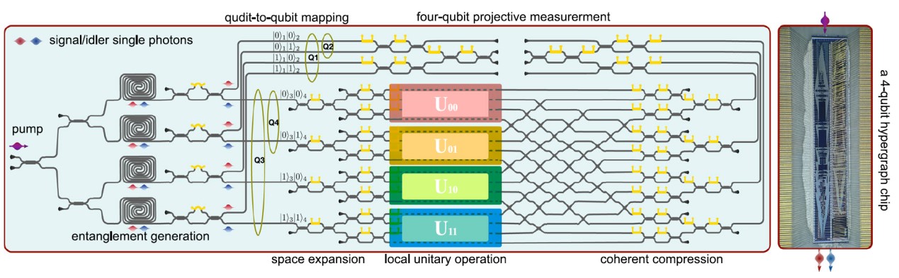 近日,北京大学物理学院现代光学研究所“极端光学创新研究团队”的王剑威研究员和龚旗煌院士团队在硅基集成光量子芯片上演示了基于超图态的量子信息处理与量子计算。研究团队在硅基可编程光量子芯片上发展了态空间等价方法,实现了完备四比特超图态(27类超图态+2类图态)的芯片上制备、调控、测量与实验判定,演示了基于测量超图态的通用量子计算基本操作,验证了基于超图态的盲量子计算功能。2024年3月23日,相关研究成果以“基于超图态的量子信息处理”(Demonstration of hypergraph-state quantum information processing)为题,发表于《自然·通讯》(Nature Communications)。