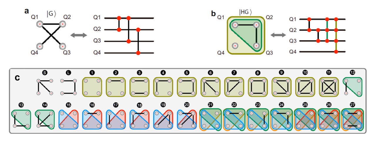 图1. 量子图态与量子超图态的定义。(a)量子图态,(b)量子超图态,(c)四比特量子超图态的完备分类。