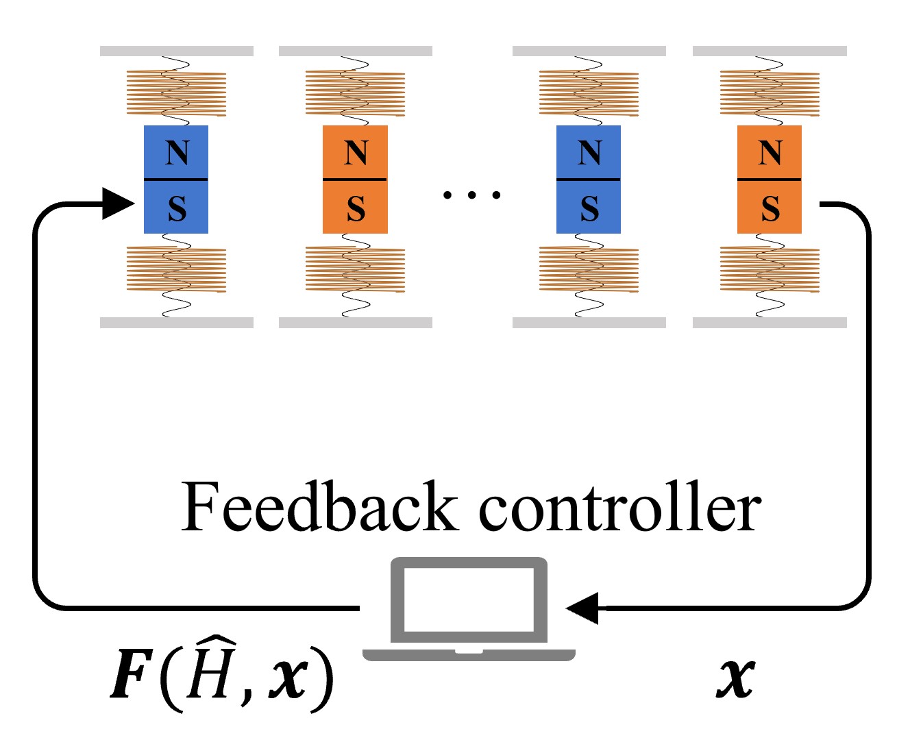 图2:基于机械元件组成的测量反馈系统。其中,每个机械元件由弹簧振子,偶极磁铁以及反亥姆霍兹线圈组成,通过对机械振子实时监测与反馈实现对拓扑晶格的构造与调控。