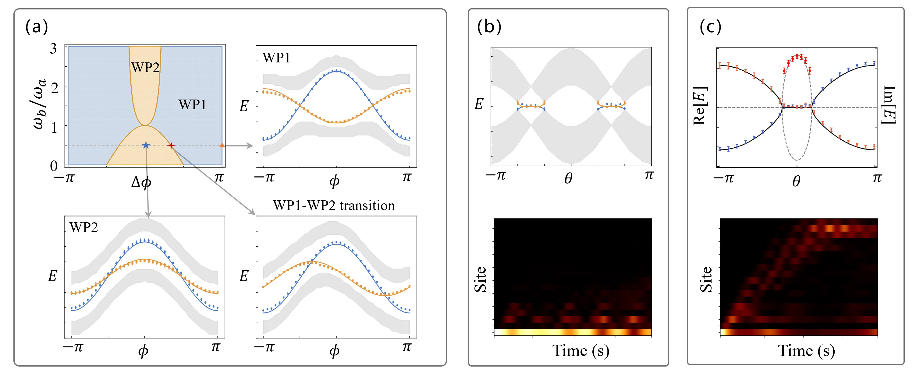 图3:(a)不同类型外尔点的能带结构;(b)厄米系统下的表面态费米弧及拓扑非平庸区域机械振子动力学演化行为;(c)非厄米系统下的外尔环结构以及趋肤效应影响下的拓扑模式。