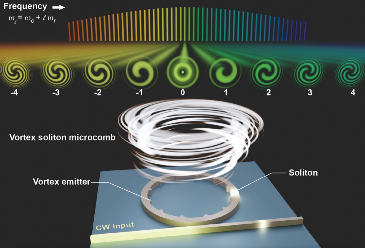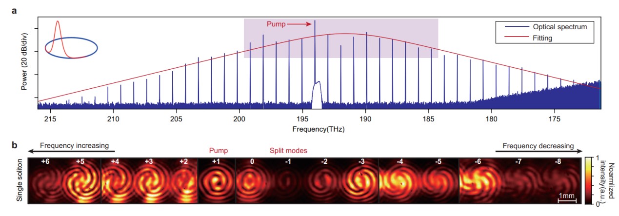 近日,北京大学物理学院现代光学研究所、人工微结构和介观物理国家重点实验室、纳光电子前沿科学中心“极端光学创新研究团队”杨起帆研究员、刘文静研究员、肖云峰教授以及龚旗煌院士等人合作,在实验上首次基于光子芯片获得了携带轨道角动量特性的光学频率梳。2024年3月29日,相关研究成果以“集成涡旋孤子微梳”(Integrated vortex soliton microcombs)为题,发表于《自然•光子学》(Nature Photonics)。