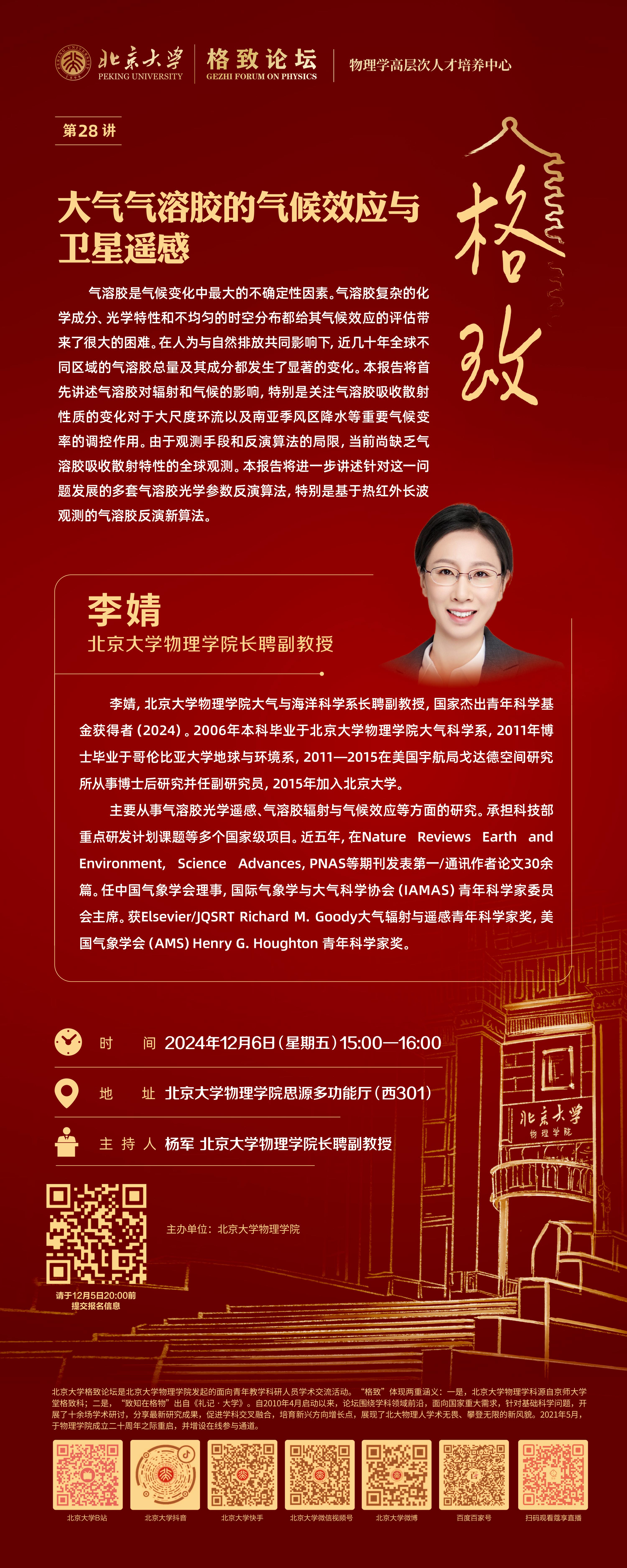 李婧,北京大学物理学院大气与海洋科学系长聘副教授,国家杰出青年科学基金获得者(2024)。2006年本科毕业于北京大学物理学院大气科学系,2011年博士毕业于哥伦比亚大学地球与环境系,2011—2015在美国宇航局戈达德空间研究所从事博士后研究并任副研究员,2015年加入北京大学。