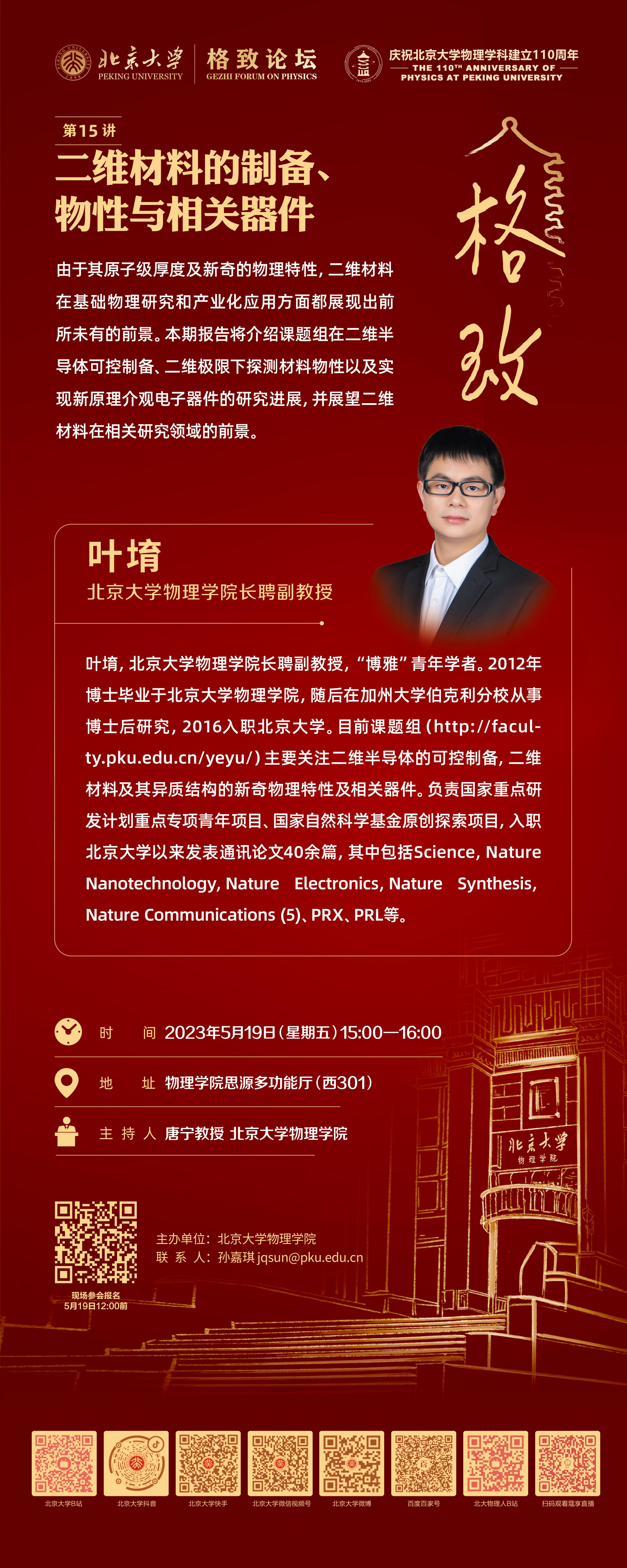 叶堉,北京大学物理学院长聘副教授,“博雅”青年学者。2012年博士毕业于北京大学物理学院,随后在加州大学伯克利分校从事博士后研究,2016入职北京大学。目前课题组(http://faculty.pku.edu.cn/yeyu/)主要关注二维半导体的可控制备,二维材料及其异质结构的新奇物理特性及相关器件。负责国家重点研发计划重点专项青年项目、国家自然科学基金原创探索项目,入职北京大学以来发表通讯论文40余篇,其中包括Science,Nature Nanotechnology,Nature Electronics,Nature Synthesis,Nature Communications (5)、PRX、PRL等。