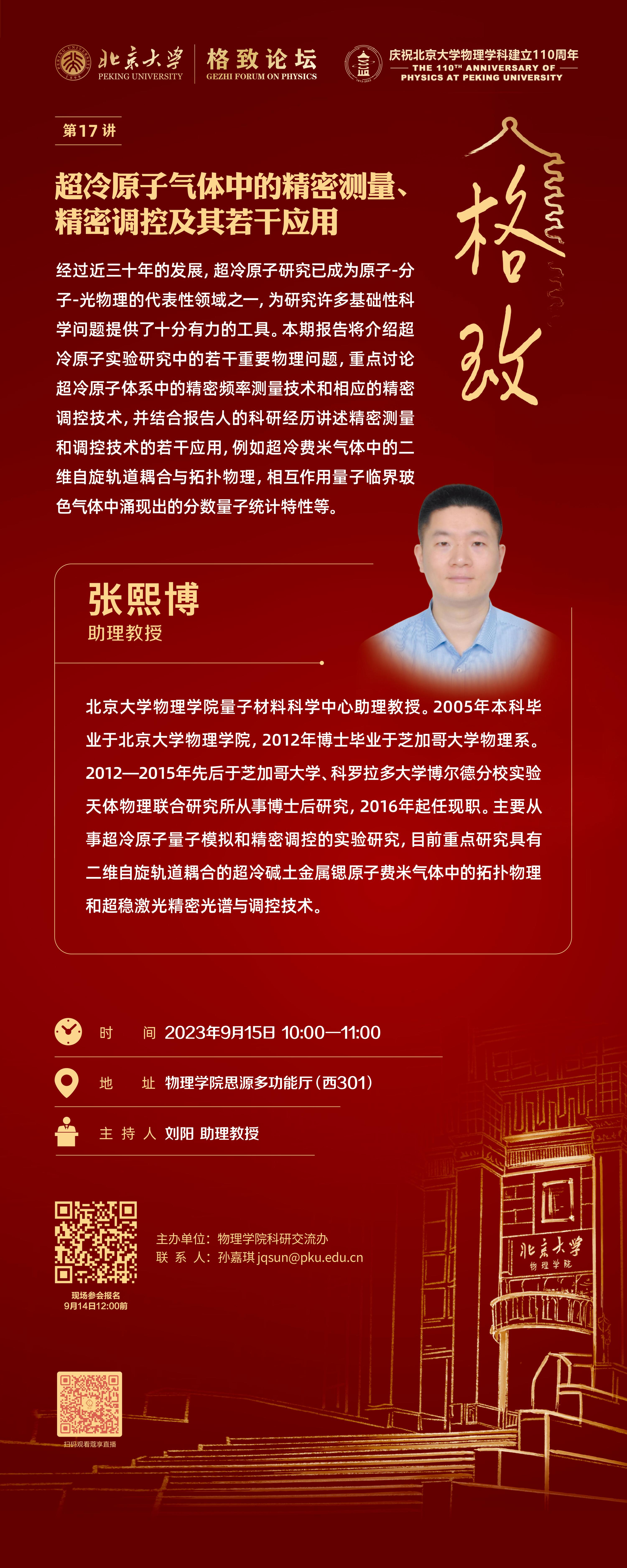 张熙博,北京大学物理学院量子材料科学中心助理教授。2005年本科毕业于北京大学物理学院,2012年博士毕业于芝加哥大学物理系。2012—2015年先后于芝加哥大学、科罗拉多大学博尔德分校实验天体物理联合研究所从事博士后研究,2016年起任现职。主要从事超冷原子量子模拟和精密调控的实验研究,目前重点研究具有二维自旋轨道耦合的超冷碱土金属锶原子费米气体中的拓扑物理和超稳激光精密光谱与调控技术。