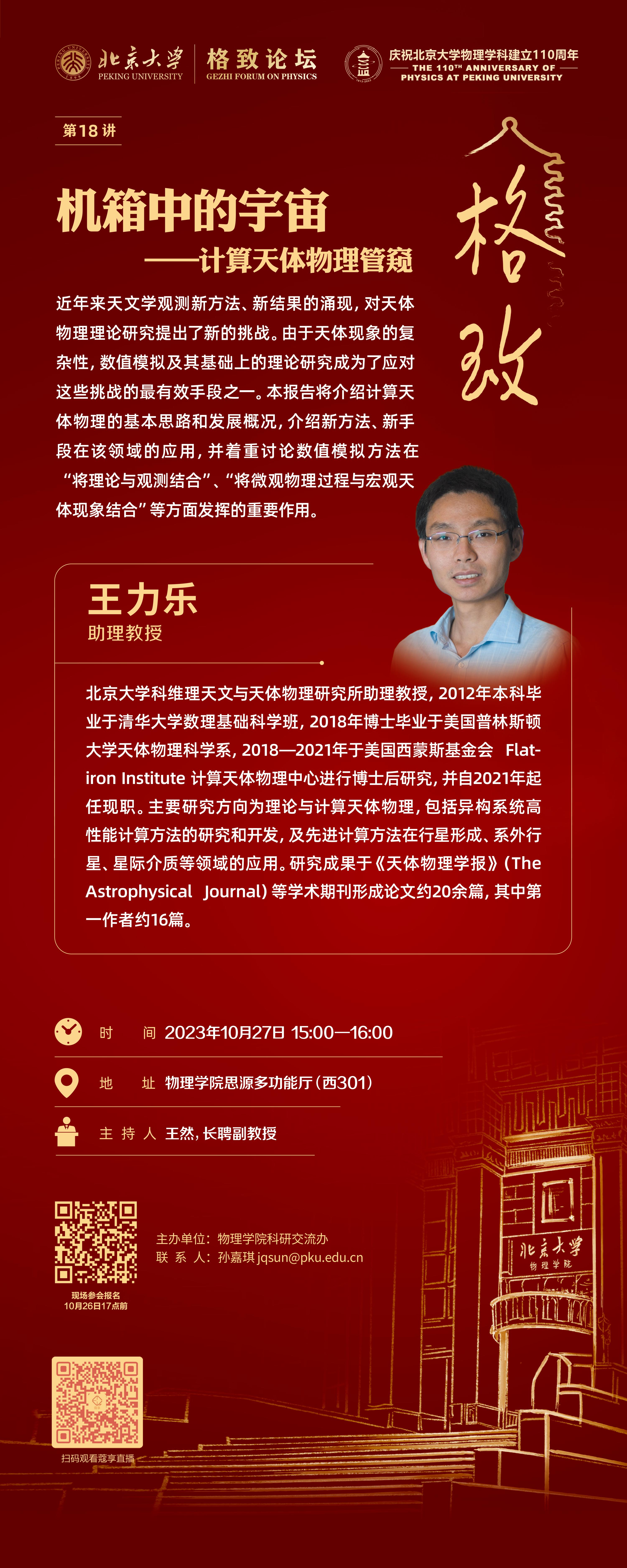王力乐,北京大学科维理天文与天体物理研究所助理教授。2012 年本科毕业于清华大学数理基础科学班,2018 年博士毕业于美国普林斯顿大学天体物理科学系,2018—2021 年于美国西蒙斯基金会 Flatiron Institute 计算天体物理中心进行博士后研究,并自 2021 年起任现职。主要研究方向为理论与计算天体物理,包括异构系统高性能计算方法的研究和开发,及先进计算方法在行星形成、系外行星、星际介质等领域的应用。研究成果于《天体物理学报》(The Astrophysical Journal)等学术期刊形成论文约 20 余篇,其中第一作者约 16 篇。