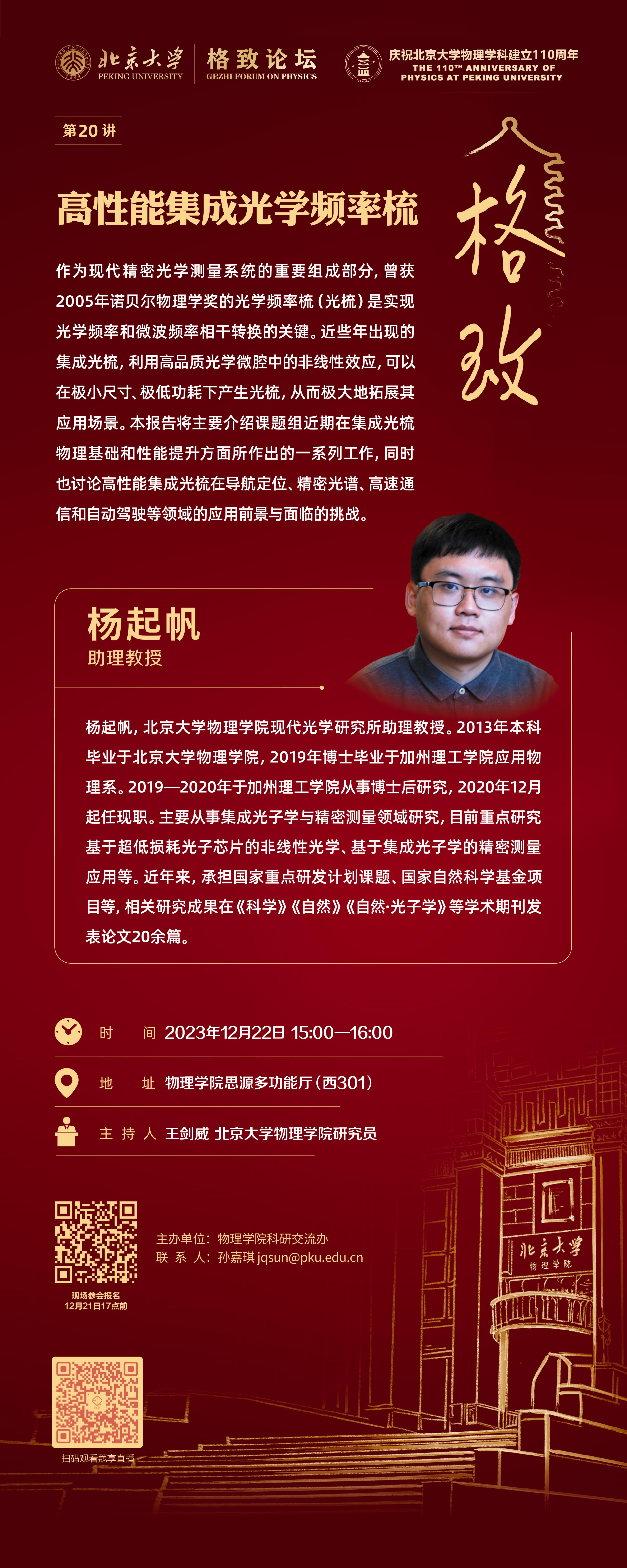 杨起帆,北京大学物理学院现代光学研究所助理教授。2013年本科毕业于北京大学物理学院,2019年博士毕业于加州理工学院应用物理系。2019—2020年于加州理工学院从事博士后研究,2020年12月起任现职。主要从事集成光子学与精密测量领域研究,目前重点研究基于超低损耗光子芯片的非线性光学、基于集成光子学的精密测量应用等。近年来,承担国家重点研发计划课题、国家自然科学基金项目等,相关研究成果在《科学》《自然》《自然·光子学》等学术期刊发表论文20余篇。