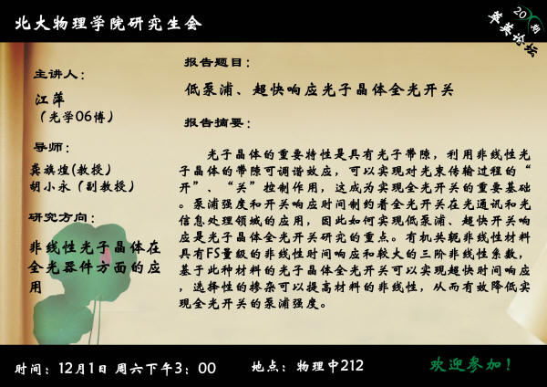江萍的研究方向是非线性光子晶体在全光器件方面的应用,她这次给我们带来的报告题目是“低泵浦、超快响应光子晶体全光开关”。她一直致力于光子晶体光开关和可调谐滤波器的研究。本次报告中江萍博士先是详细讲述了光子晶体光开关的研究现状以及二维有机光子晶体光开关的设计,之后又讲了其它相关工作,包括光子晶体微腔结构设计和测量,可调谐光子晶体滤波器的研究等。