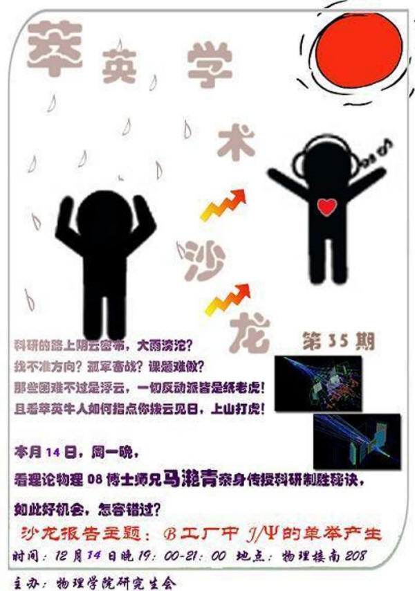马滟青同学主要从事重夸克偶素方面的研究工作,在本期这“萃英”沙龙中,他给大家介绍了他发表在PRL上的工作“B工厂中J/Ψ的单举产生”(点击下载)。之后,主讲人又从自己的切身经历出发、并具体结合此次介绍的工作,图文并茂的给大家介绍了他的科研心得,包括怎样合理的选择课题、如何充分的利用资源以及怎样全面的呈现自己的成果等问题。