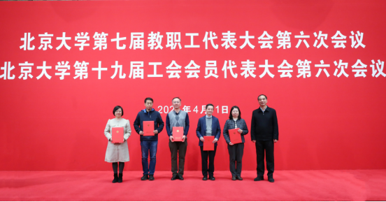 4月11日,在北京大学第七届教职工代表大会第六次会议暨北京大学第十九届工会会员代表大会第六次会议上,物理学院四位校教代会代表获“优秀提案奖”。北京大学校长龚旗煌为获奖代表颁发证书。