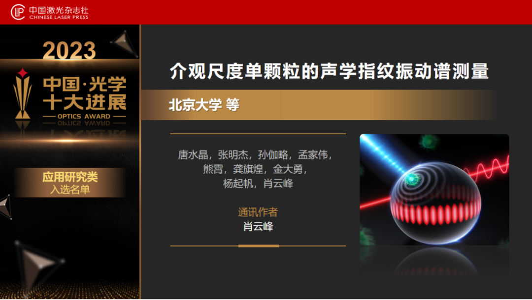 北京大学物理学院现代光学研究所、人工微结构和介观物理国家重点实验室、纳光电子前沿科学中心肖云峰教授与龚旗煌院士领导的课题组,针对兆赫-千兆赫频率窗口声学振动传感的长期挑战,创造性地提出了介观尺度颗粒振动测量的微腔方案,成功实现了不同种类微生物细胞的振动指纹谱识别。
