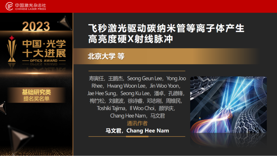 北京大学物理学院重离子物理研究所、核物理与核技术国家重点实验室马文君教授和颜学庆教授团队与韩国基础科学研究院合作利用碳纳米管人工构筑出具有三维纳米网络结构的靶材,借助拍瓦(1015W)级飞秒激光的超强光场,在微米尺度内将电子加速到光速并剧烈扭摆,产生了亮度可以媲美大型同步辐射光源的硬X射线脉冲,将此类X射线源能量转换效率提升了两个数量级。该X射线脉冲光源具有非常大的照射视野和超小的源尺寸,可以实现大体积样品的瞬态成像与物性研究,在极端条件物理研究中有重大潜力。