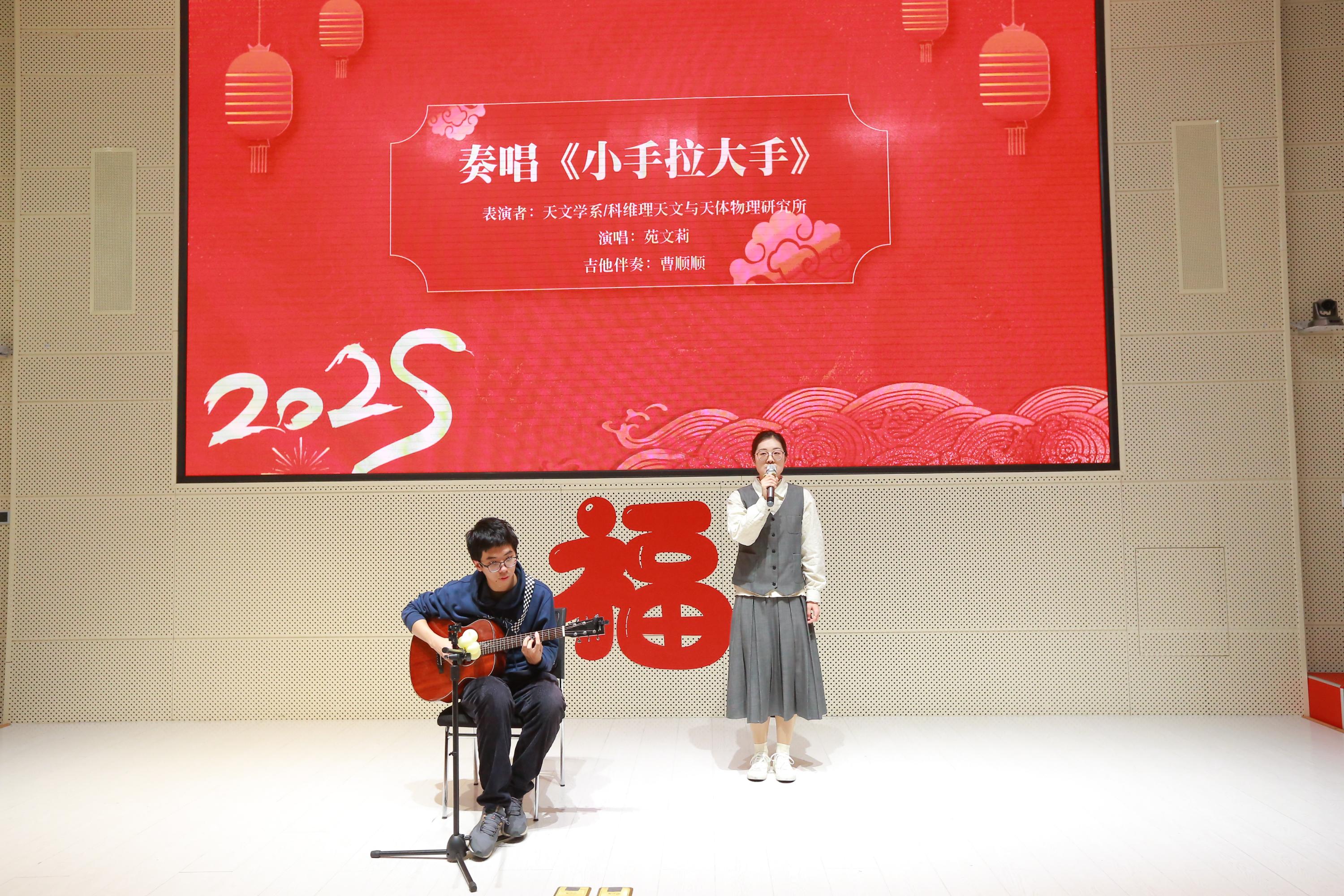 联欢部分由党委人事办公室高子晴和现代光学研究所宋博主持。学院各系、所、中心、行政团队及首佳物业等集体带来了12个富有创意和热情的文艺节目,包括合唱、舞蹈、器乐、走秀等。节目纷呈,妙趣横生,舞台上的每一个瞬间都洋溢着创意与激情,点燃了全场的欢笑与热情;掌声如潮,情意满怀,观众的每一次喝彩都化作暖流,将现场的氛围推向高潮,留下了无数难忘的美好回忆。