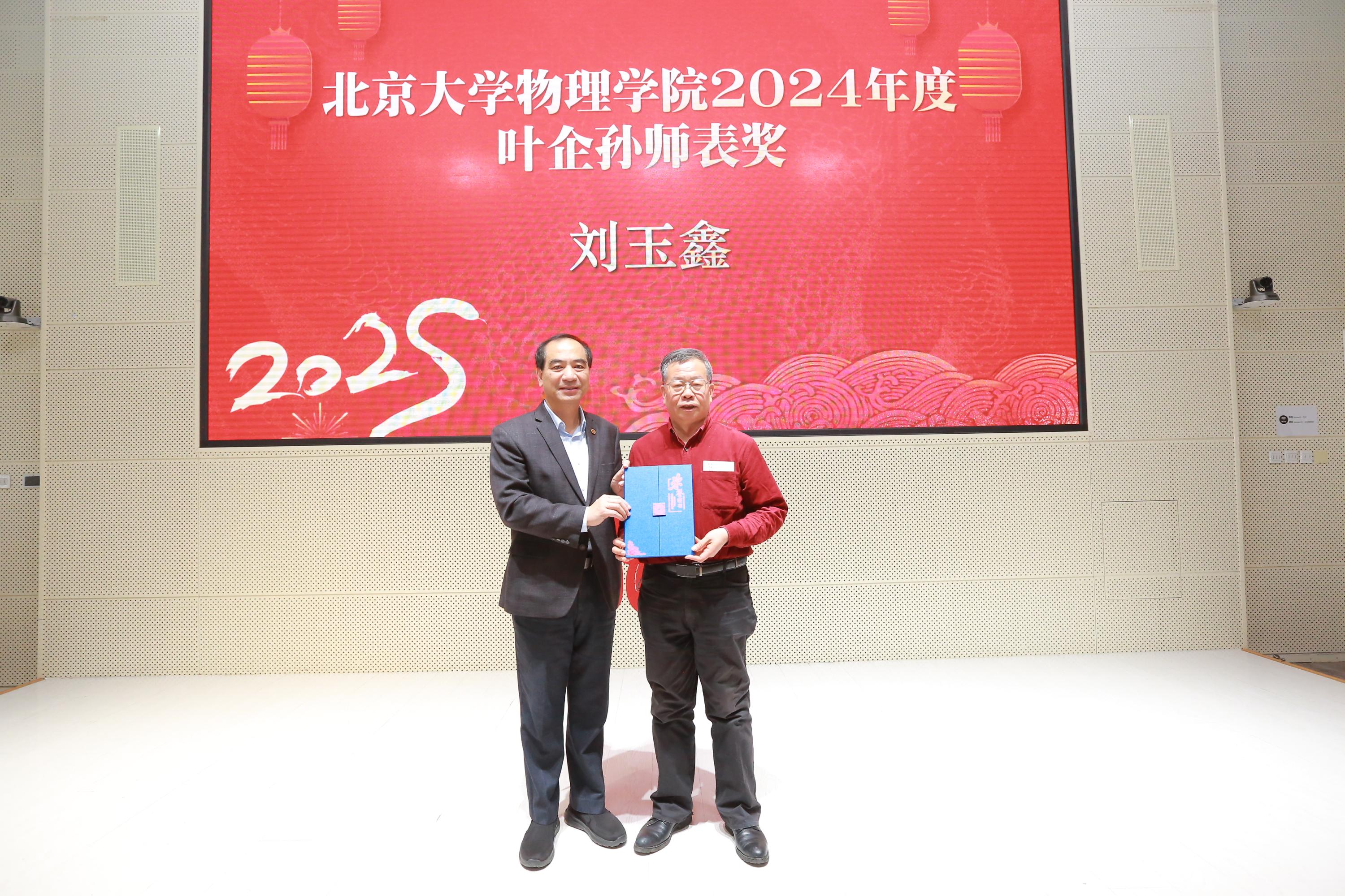 北京大学校长龚旗煌院士为2024年度“叶企孙师表奖”颁发荣誉证书,高原宁、物理学院党委书记刘雨龙分别为“实验技术奖”及学院安全管理先进个人颁发荣誉证书。叶企孙师表奖获奖者刘玉鑫教授发表了感言,分享了他在教育教学工作中的经验与感悟,赢得全场热烈掌声。