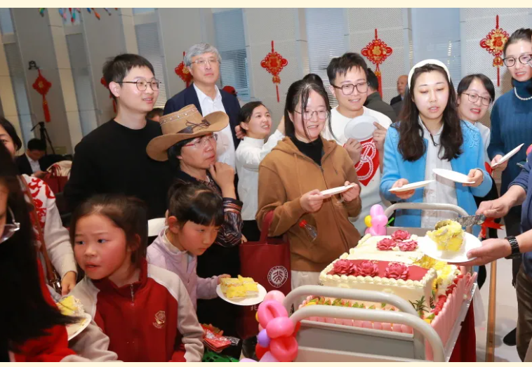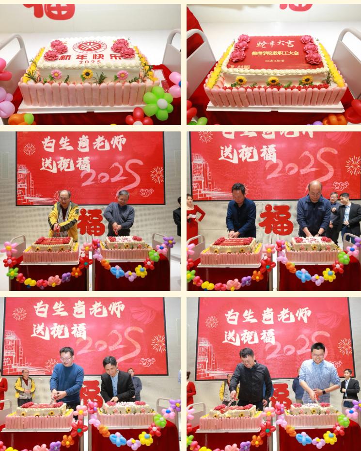 在联欢最后的特别环节,即将迎来本命年的老师们在全场掌声和祝福中来到台前,携手分切生日蛋糕,与全体参会人员共同庆祝这一难忘时刻,将整个活动推向高潮,全场洋溢着温暖与欢欣。