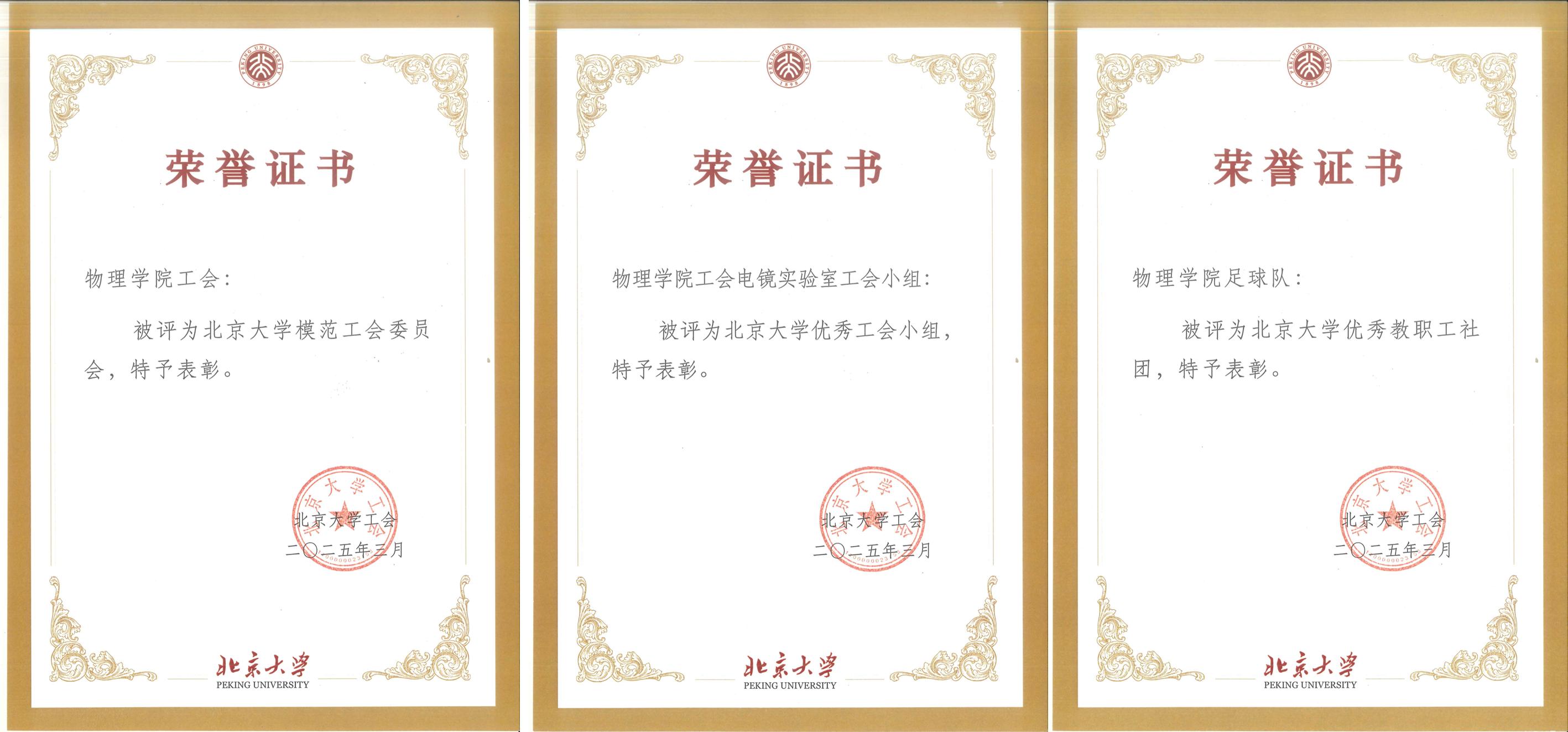2025年4月28日,北京大学工会发布《关于表彰工会系统优秀集体、优秀个人的决定》,物理学院工会和会员荣获多项集体荣誉与个人表彰。其中,物理学院工会荣获“2023、2024年北京大学模范工会委员会”称号,物理学院足球队被评为“北京大学优秀教职工社团”、电镜实验室工会小组被评为“北京大学优秀工会小组”。物理学院党委副书记、工会主席李焱被授予2024 年度“北京大学模范工会主席”称号,张志科、肖黎、吴婧、吕律四位同志被授予2024年度“北京大学优秀工会干部”称号,张焱、赵冬青、肖静波、王二青、刘诗宇五位同志被授予2024年度“北京大学优秀工会积极分子”称号。